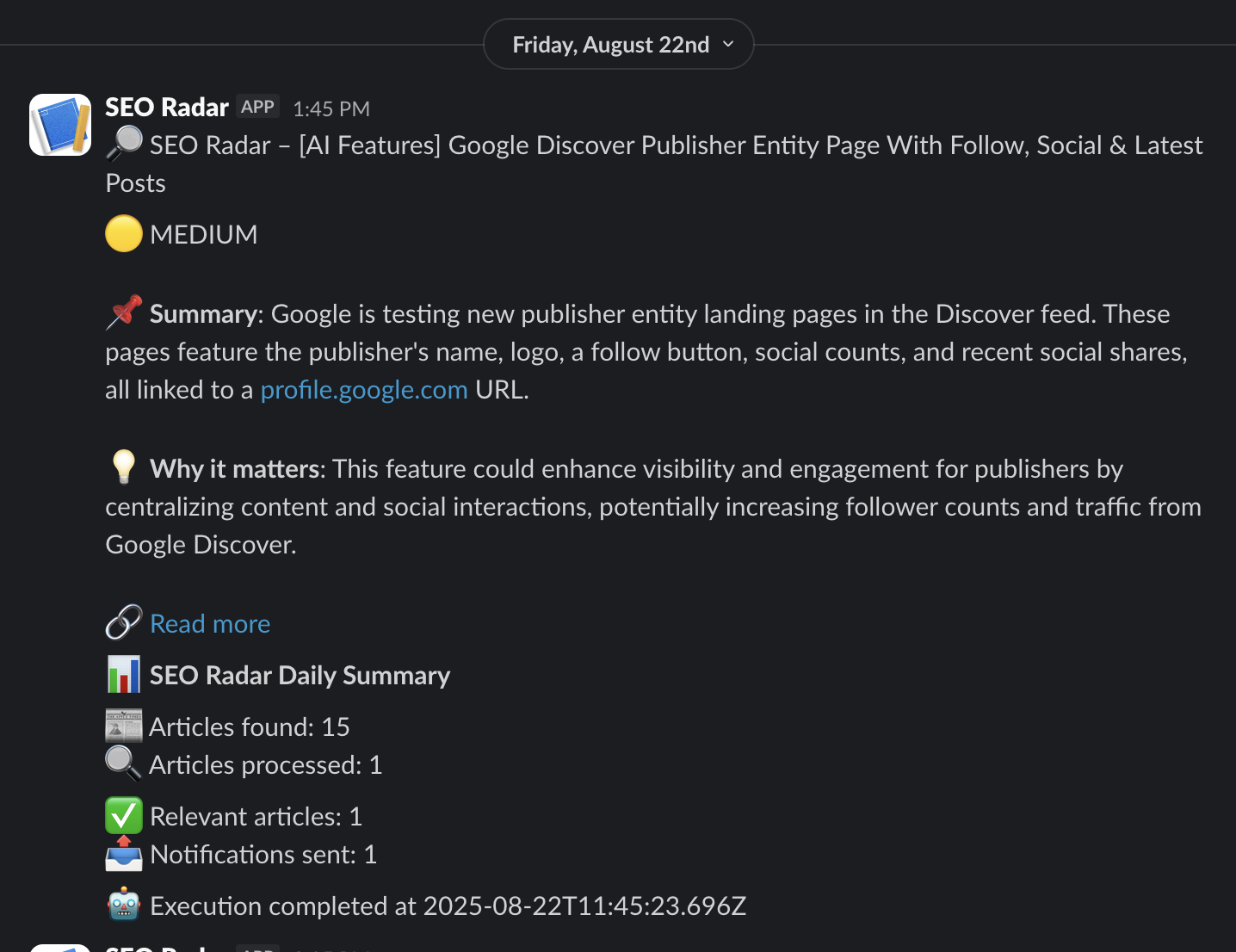 Apart from this, we also built our own AI bot that constantly scans the web for confirmed changes in Google’s algorithms and policies. Important updates are posted directly in our internal Slack channel, so we can act quickly whenever something changes.