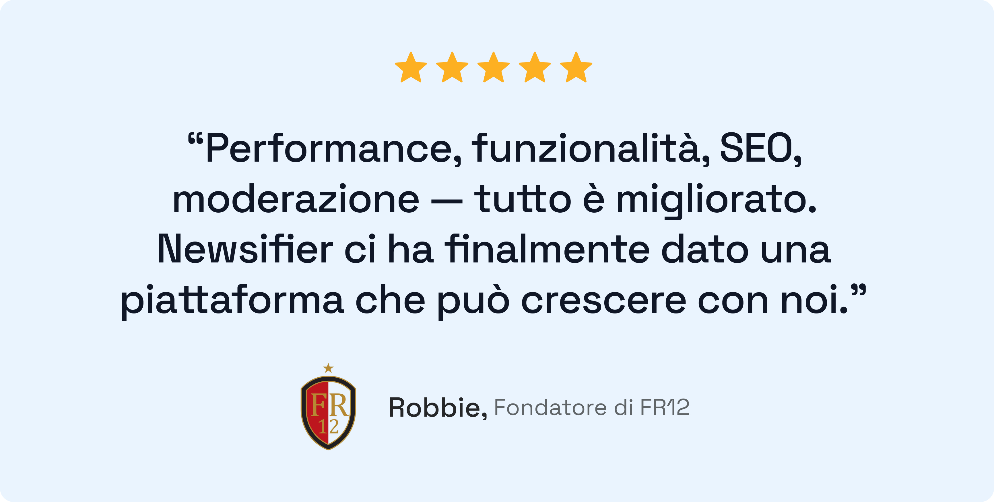 Con Newsifier, FR12 è passato da uno stress tecnico costante ad una piattaforma solida e pronta per il futuro, che migliora performance, SEO, engagement e moderazione. Il team ora può concentrarsi su ciò che conta davvero : far crescere la community dei tifosi - senza più preoccuparsi di aggiustare il lato tecnico.
